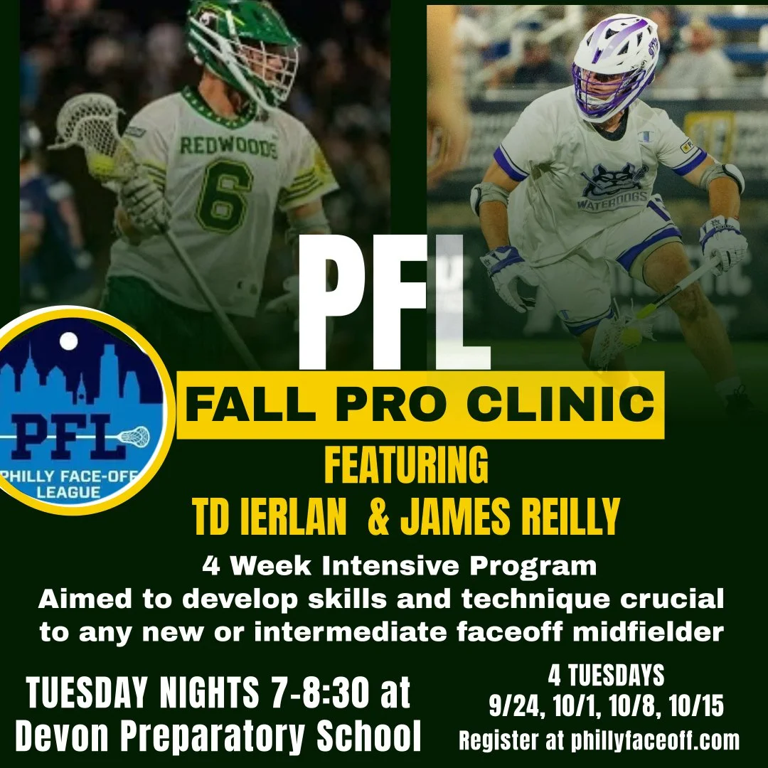 The Philly Faceoff League is proud to present the PFL Pro Clinic. A four week intensive small group program aimed to develop skills and technique crucial to any new or intermediate faceoff midfielder. The program will be led by current PLL All Star TD Ierlan (California Redwoods) and James Reilly (Current FO/M on the Carolina Chaos).
